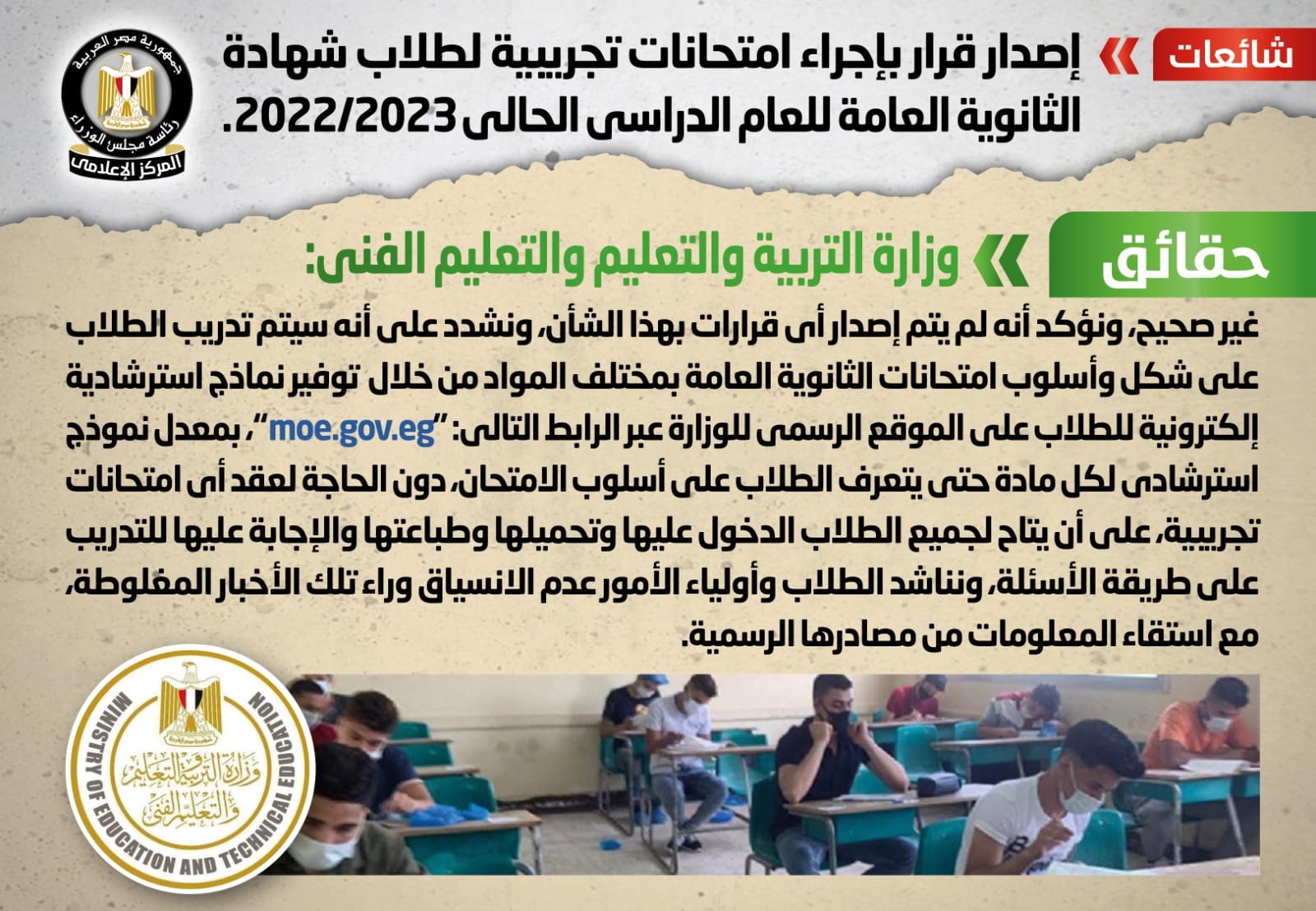 قام المركز الإعلامي لمجلس الوزراء بالتواصل مع وزارة التربية والتعليم والتعليم الفني، والتي نفت تلك الأنباء، مُؤكدةً أنه لا صحة لإجراء امتحانات تجريبية لطلاب شهادة الثانوية العامة للعام الدراسي الحالي 2022/2023، وأنه لم يتم إصدار أي قرارات بهذا الشأن، مُشددةً على أنه سيتم تدريب الطلاب على شكل وأسلوب امتحانات الثانوية العامة بمختلف المواد من خلال توفير نماذج استرشادية إلكترونية للطلاب على الموقع الرسمي للوزارة عبر الرابط التالي: "moe.gov.eg"، بمعدل نموذج استرشادي لكل مادة حتى يتعرف الطلاب على أسلوب الامتحان، دون الحاجة لعقد أي امتحانات تجريبية، على أن يتاح لجميع الطلاب الدخول عليها وتحميلها وطباعتها والإجابة عليها للتدريب على طريقة الأسئلة، مُناشدةً الطلاب وأولياء الأمور عدم الانسياق وراء تلك الأخبار المغلوطة، مع استقاء المعلومات من مصادرها الرسمية.