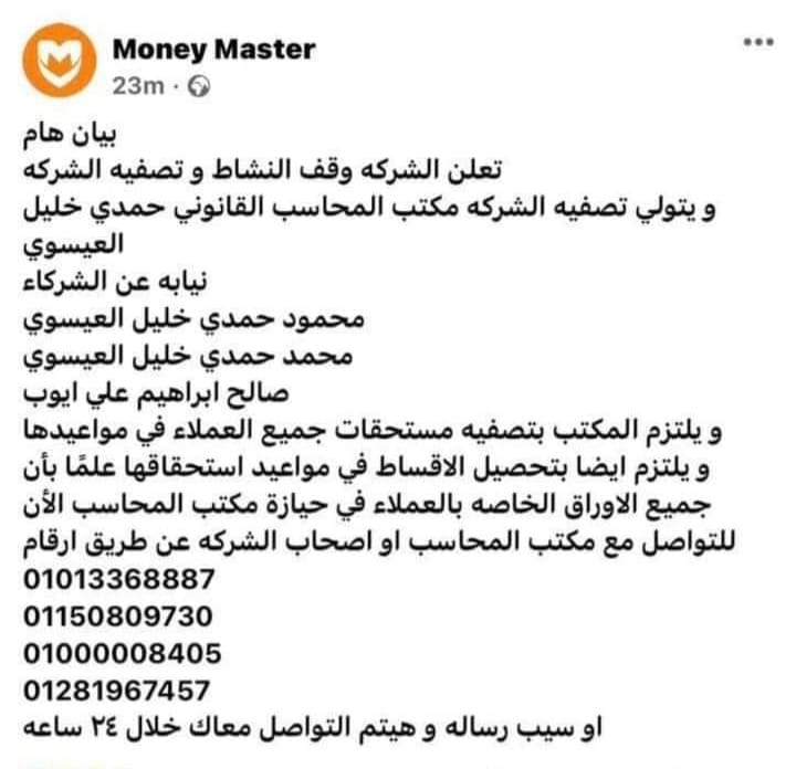 استغاث عدد من عملاء شركة ماني ماستر بالنيابة العامة، للمطالبة بسرعة التحقيق مع المسؤولين بشركة "ماني ماستر" للتكنولوجيا المالية، وهي عبارة عن تطبيق خاص بالجمعيات، حيث أعلنت الشركة عن تصفية أعمالها قبل أن تقوم بإغلاق الصفحة الخاصة بها على فيس بوك، وأكد العملاء أنهم لم يتمكنوا حتى الآن من التواصل مع الشركة للحصول على مستحقاتهم المالية، حيث إن البعض لديه مستحقات مادية كبيرة لدى الشركة والتي تتمثل في "قبض الجمعية" والذي يصل لمبلغ ربع مليون جنيه، والبعض الآخر لديه مستحقات ما سددوه شهريًا.