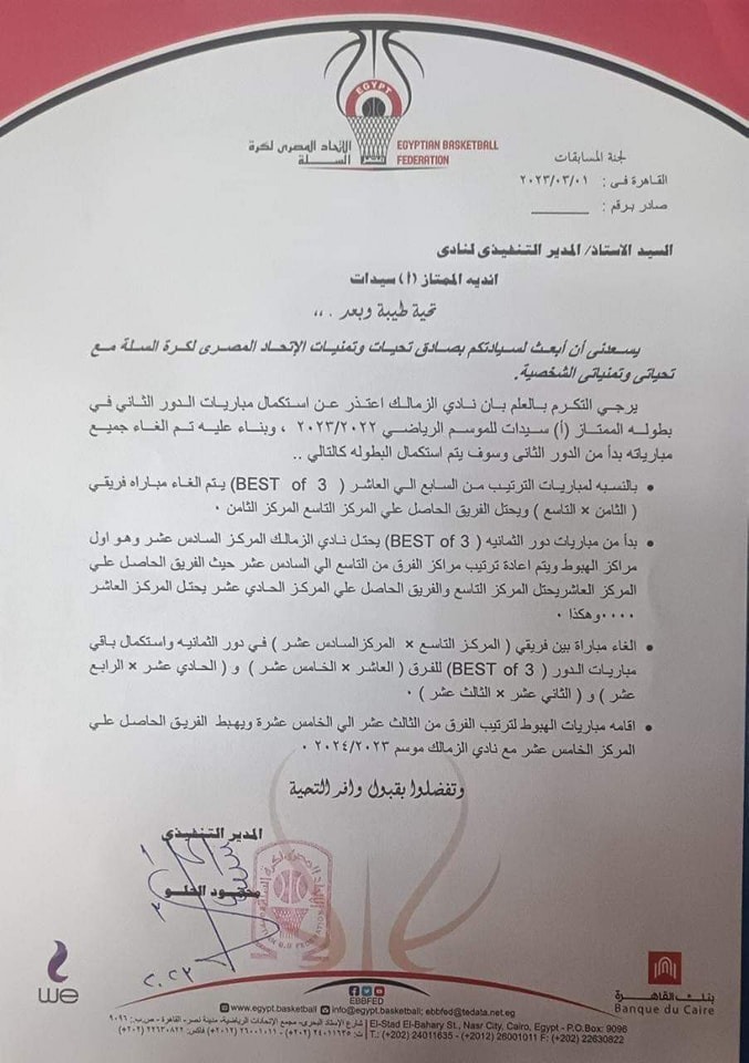 خاطب اتحاد السلة أندية الدوري ، بهبوط نادي الزمالك للدرجة الثانية في دوري السيدات بعد انسحابه من المسابقة بجانب إلغاء مبارياته في الدور الثاني من الموسم الحالي.