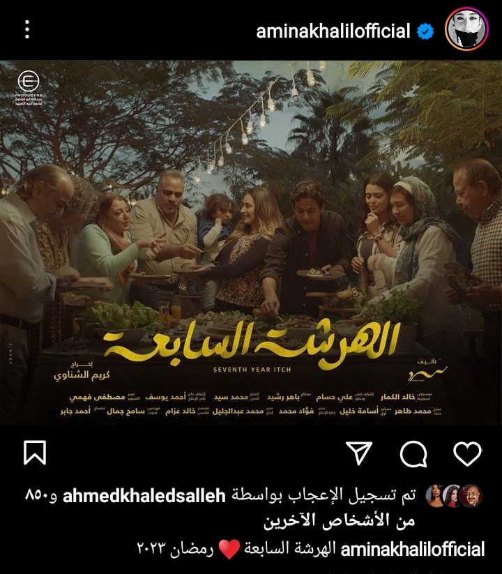 ونشرت أمينة خليل صورة البوستر الرسمي لمسلسل "الهرشة السابعة"، عبر حسابها الشخصي بموقع تبادل الصور والفيديوهات الشهير "إنستجرام"، وعلقت قائلة: "الهرشة السابعة رمضان 2023".