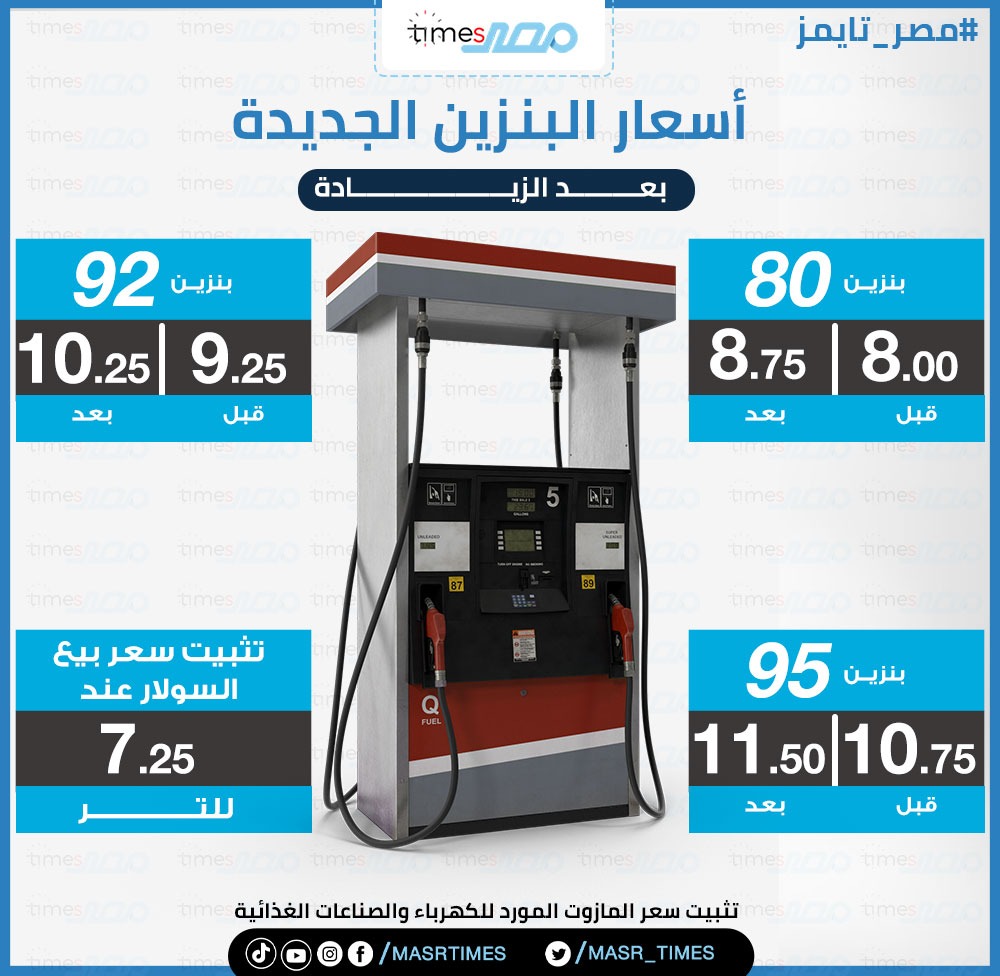 قررت لجنة التسعير التلقائى للمنتجات البترولية المعنية بمتابعة وتنفيذ آليات تطبيق التسعير التلقائى للمنتجات البترولية بشكل ربع سنوى فى اجتماعها التوصية بتعديل الأسعار الحالية السائدة فى السوق المحلى ، حيث تم تعديل سعر بيع منتجات البنزين بأنواعه الثلاثة اعتبارا من الساعة الثانية صباح يوم 02 / 03 / 2023 لتصبح كالآتى 8.75 جنيه للتر البنزين 80 و 10.25 جنيه للتر البنزين 92 و 11.50 جنيه للتر البنزين 95 وسعر بيع طن المازوت لغير استخدامات الكهرباء والمخابز ليصبح 6000 جنيه للطن وتثبيت سعر بيع السولار عند 7.25 جنيه للتر وتثبيت سعر المازوت المورد للكهرباء والصناعات الغذائية و تم زيادة غاز تموين السيارت ليصبح 4.50 جنيه / متر .
