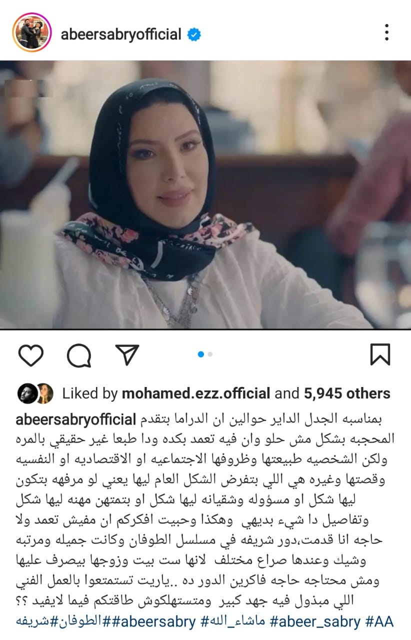 وكتبت عبير صبري: "بمناسبة الجدل الداير حوالين أن الدراما بتقدم المحجبة بشكل مش حلو وإن فيه تعمد بكده ودا طبعاً غير حقيقي بالمرة ولكن الشخصية طبيعتها وظروفها الاجتماعية أو الاقتصادية أو النفسية وقصتها وغيره هي اللي بتفرض الشكل العام ليها يعني".