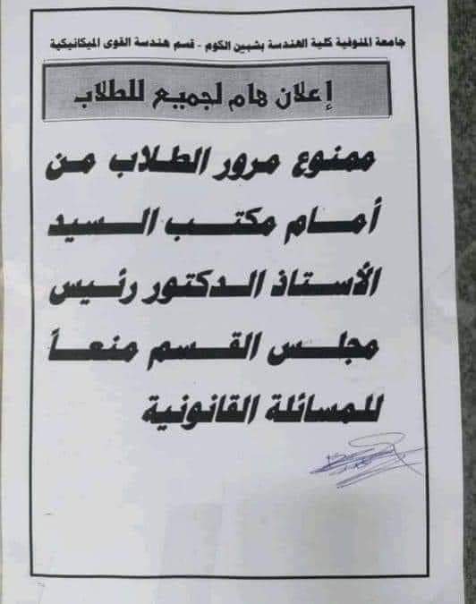 وحملت اللافتة الموجودة على مكتب رئيس قسم القوى الميكانيكية بكلية الهندسة جامعة المنوفية إعلان هام لجميع الطلاب، ممنوع مرور الطلاب من أمام مكتب السيد الدكتور رئيس مجلس القسم منعا للمساءلة القانونية.