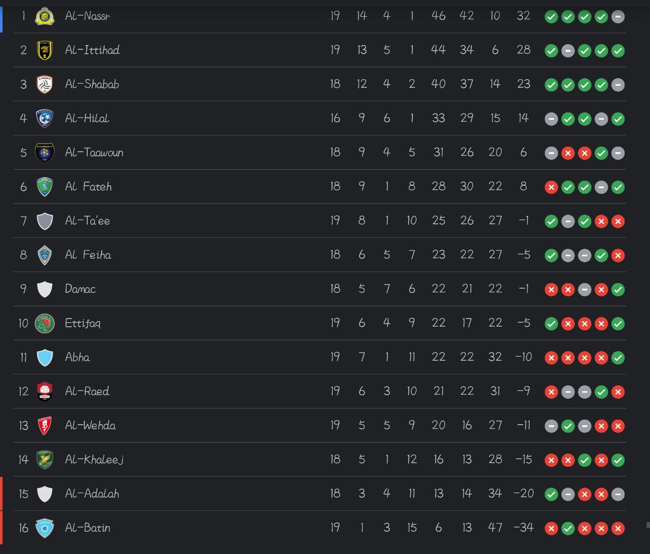 ويتربع فريق النصر السعودي، بقيادة كريستيانو رونالدو، نجم منتخب البرتغال، علي عرش صدراة جدول ترتيب الدورى السعودي ، برصيد 46 نقطة، جمعهما بعد ان خاض 19 مباراة ، حقق الفوز في 4 لقاء، وتعادل في 4 وخسر مباراة واحدة، وسجل لاعبي العالمي 42 هدف وتلقت شباكهم 10 أهداف.