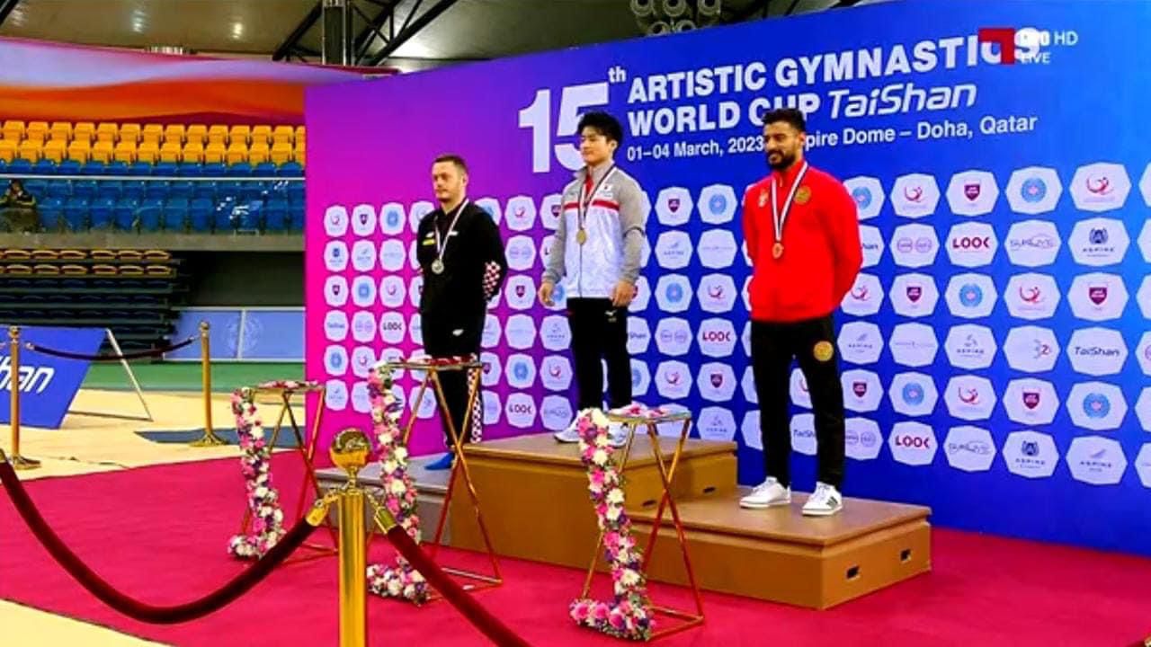 وزير الرياضة يهنىء لاعب منتخب الجمباز بفوزه ببرونزية كأس العالم بقطر