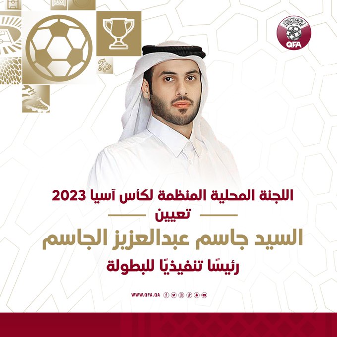 أصدرت اللجنة المنظمة المحلية لكأس آسيا لكرة القدم قرارها رقم (1) لسنة 2023 بتعيين السيد جاسم عبدالعزيز الجاسم رئيساً تنفيذياً للبطولة التي تنظمها قطر خلال الفترة ما بين 12 يناير وحتى 10 فبراير 2024 .