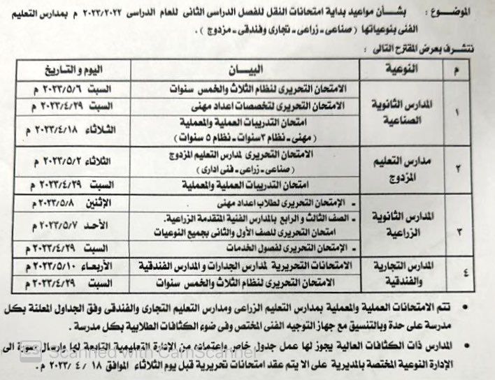 وتابعت المديرية، أنه بالنسبة لمدارس التعليم المزدوج، فمن المقرر أن ينطلق الامتحان التحريري لمدارس التعليم المزدوج "صناعي، زراعي، فني إداري"، الثلاثاء الموافق 2 مايو المقبل، أما امتحان التدريبات العملية والمعملية فمن المقرر أن يبدأ 29 أبريل المقبل.
