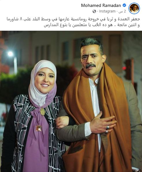 وعلق محمد رمضان، عبر حسابه الشخصى على موقع التواصل الاجتماعى "فيسبوك"، قائلًا :" جعفر العمدة و ثريا في خروجة رومانسية، عازمها في وسط البلد على ٨ شاورما و اتنين مانجة".
