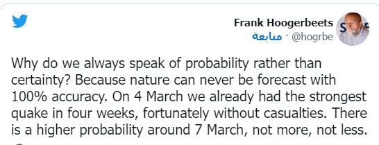 وكتب في تغريدة، أن هناك احتمالية كبيرة لوقوع زلزال قوي في 7 مارس، قائلاً: "لماذا نتحدث دائماً عن احتمالات وليس عن أمور مؤكدة؟ لأنه مع الطبيعة لا يمكن التنبؤ بالأحداث بنسبة 100%. في 4 مارس عشنا أقوى زلزال منذ 4 أسابيع، ولحسن الحظ لم يوقع ضحايا. هناك احتمالية أكبر في 7 مارس، ليس أكثر وليس أقل".