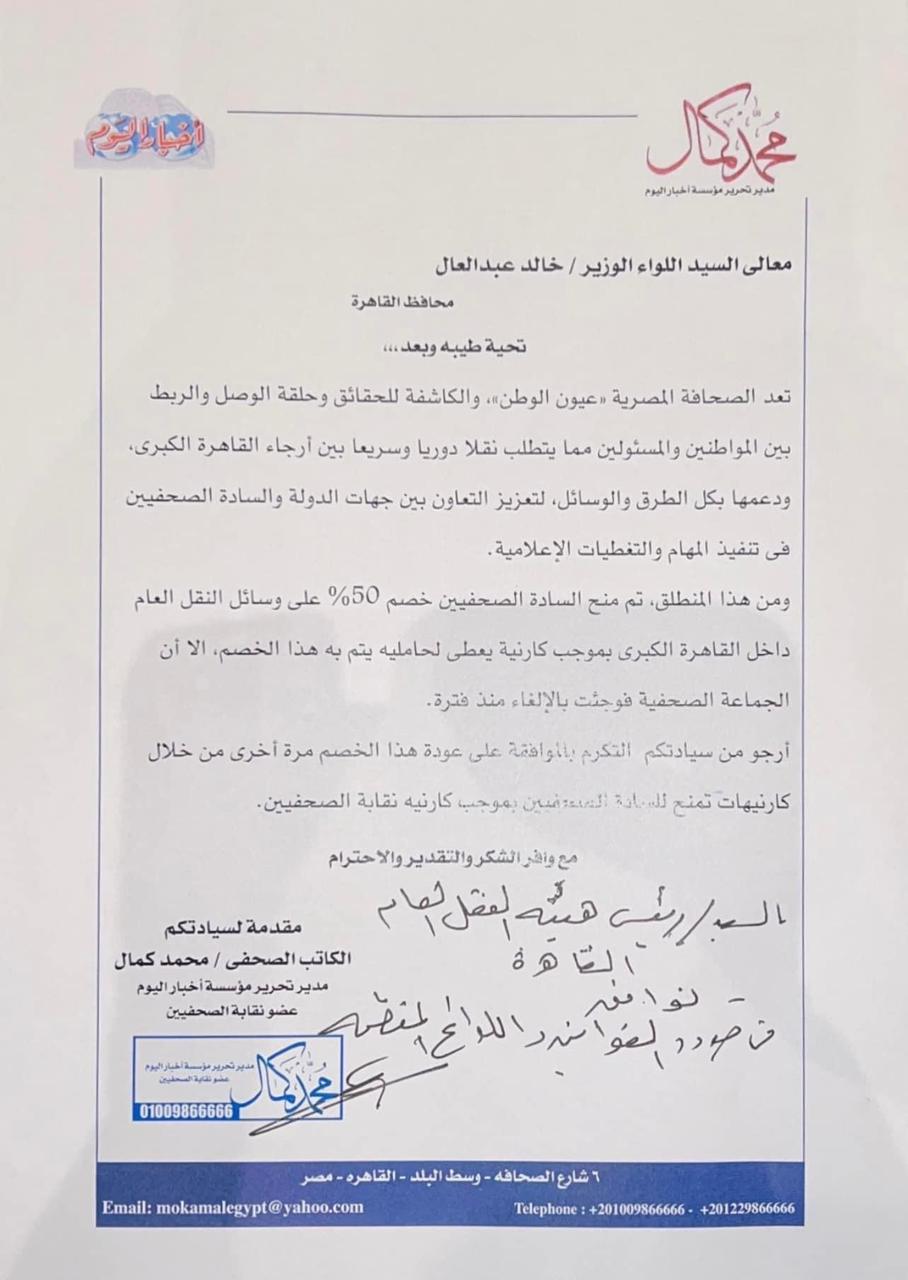 تقدم الكاتب الصحفي محمد كمال، المرشح لعضوية مجلس نقابة الصحفيين "تحت السن" بانتخابات التجديد النصفي، بطلب رسمي إلى اللواء خالد عبدالعال محافظ القاهرة من أجل منح الصحفيين خصم 50% على أسعار تذاكر هيئة النقل العام بالقاهرة الكبرى.
