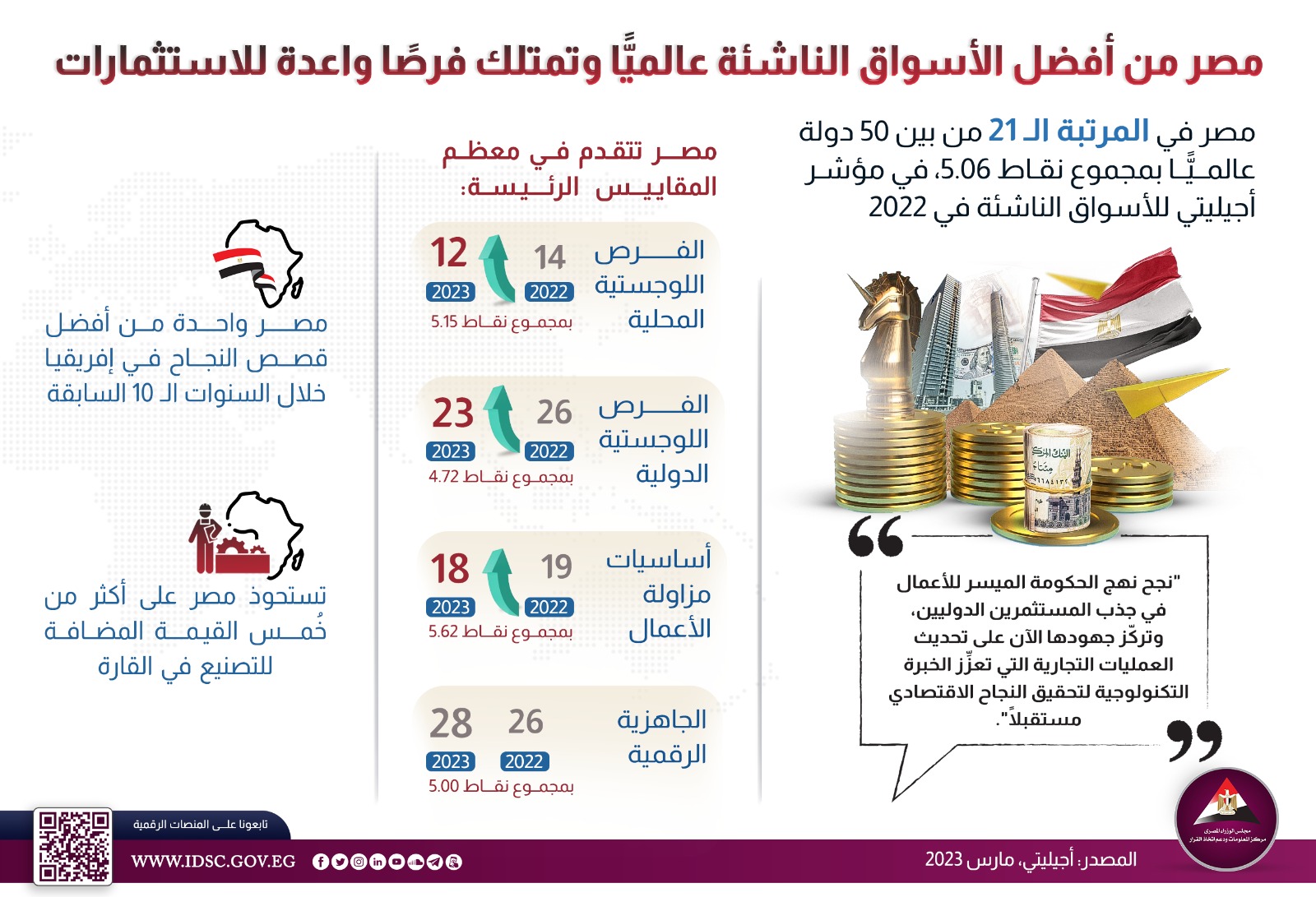 نشر مركز المعلومات ودعم اتخاذ القرار بمجلس الوزراء إنفوجرافيك جديدًا يرصد خلاله نظرة مؤسسة أجيليتي للسوق المصرية باعتبارها ضمن أفضل 50 سوقًا ناشئة عالمية في النسخة الـ14 من مؤشرها السنوي "مؤشر أجيليتي للأسواق الناشئة 2023"، والذي يهدف إلى قياس مجموعة من البيانات الاقتصادية والتجارية لتصنيف 50 دولة من الأسواق الناشئة عالميًّا من خلال 4 مقاييس رئيسة؛ بناءً على استطلاع آراء 750 مديرًا تنفيذيًّا عالميًّا في قطاع الخدمات اللوجستية.