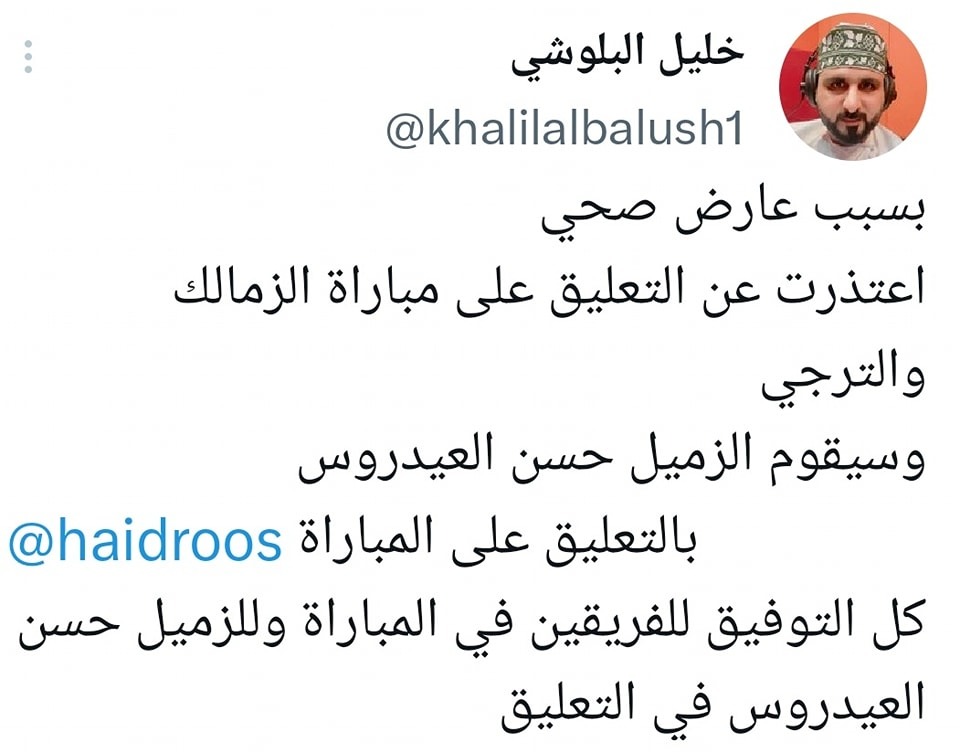 وغرد خليل البلوشي، عبر صفحته الرسمية علي موقع التواصل الإجتماعي "توتير" قائلاً : "بسبب عارض صحي، اعتذرت عن التعليق على مباراة الزمالك والترجي، وسيقوم الزميل حسن العيدروس ،بالتعليق على المباراة ، كل التوفيق للفريقين في المباراة وللزميل حسن العيدروس في التعليق".