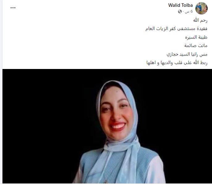 وتبين من التحريات أنها تدعي"رانيا حجازي" وتبلغ من العمر 27 عام ممرضه ممارسة في مستشفى كفر الزيات العام.