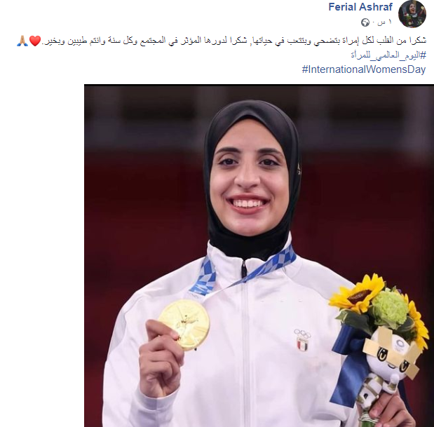 وجهت فريال أشرف بطلة الكاراتية، الحاصلة علي الميدالية الذهبية لأولمبياد طوكيو 2020، رسالة إلى النساء ، بمناسبة اليوم العالمي للمرأة الموافق 8 من مارس.