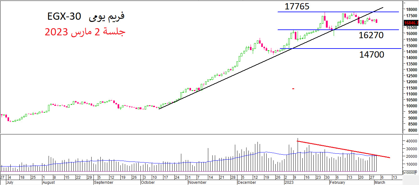 وكان محمد عثمان قد أكد أن مؤشر السوق الرئيسي"ايجي اكس30" فى نهاية تعاملات جلسة الخميس من الاسبوع الماضى اغلق عند 16846 و من الملاحظ تحرك المؤشر فى الفترة الأخيرة بشكل عرضى من بداية فبراير 2023 بين منطقة 17765 و بين 16600 و ظهر أداء سلبى لبعض أسهم المؤشر إنعكس ذلك بشكل ملحوظ فى أخر جلسة مدفوع بييع الصناديق الأجنبية لهذا يجب أن نشير لبعض المناطق التى يمكن أن تحدد إتجاة أو حركة المؤشر فى الفترة القادمة أهمها منطقة 17360التى إذا تم إختراقها يمكن أن نرى صعود مرة اخرى قرب منطقة 17765 التى فشل المؤشر فى إختراقها بعد عدة محاولات و أصبح إختراقها علامة على عودة القوة الشرائية مرة اخرى لهذا فالبقاء تحت 17360 يدفعنا الى .