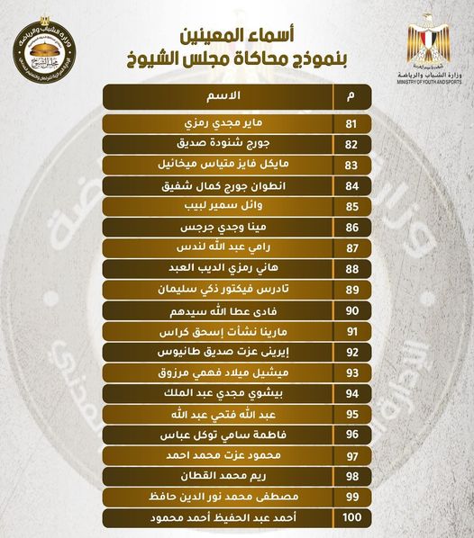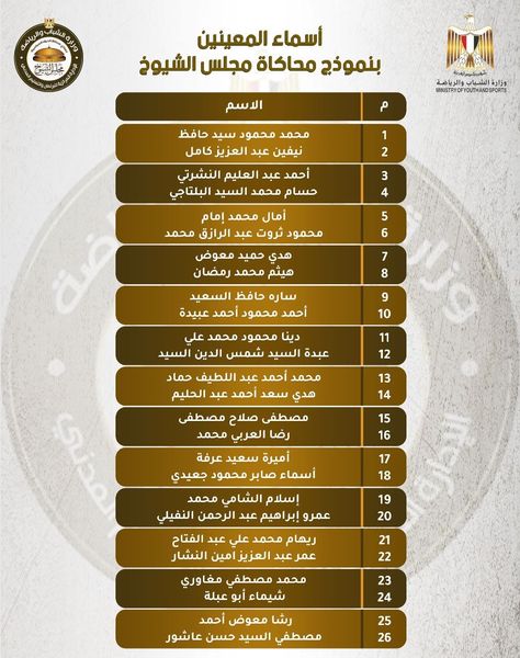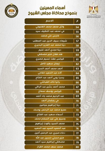 بالأسماء.. وزارة الشباب تعلن قائمة المعينين بـ"نموذج محاكاة مجلس الشيوخ"