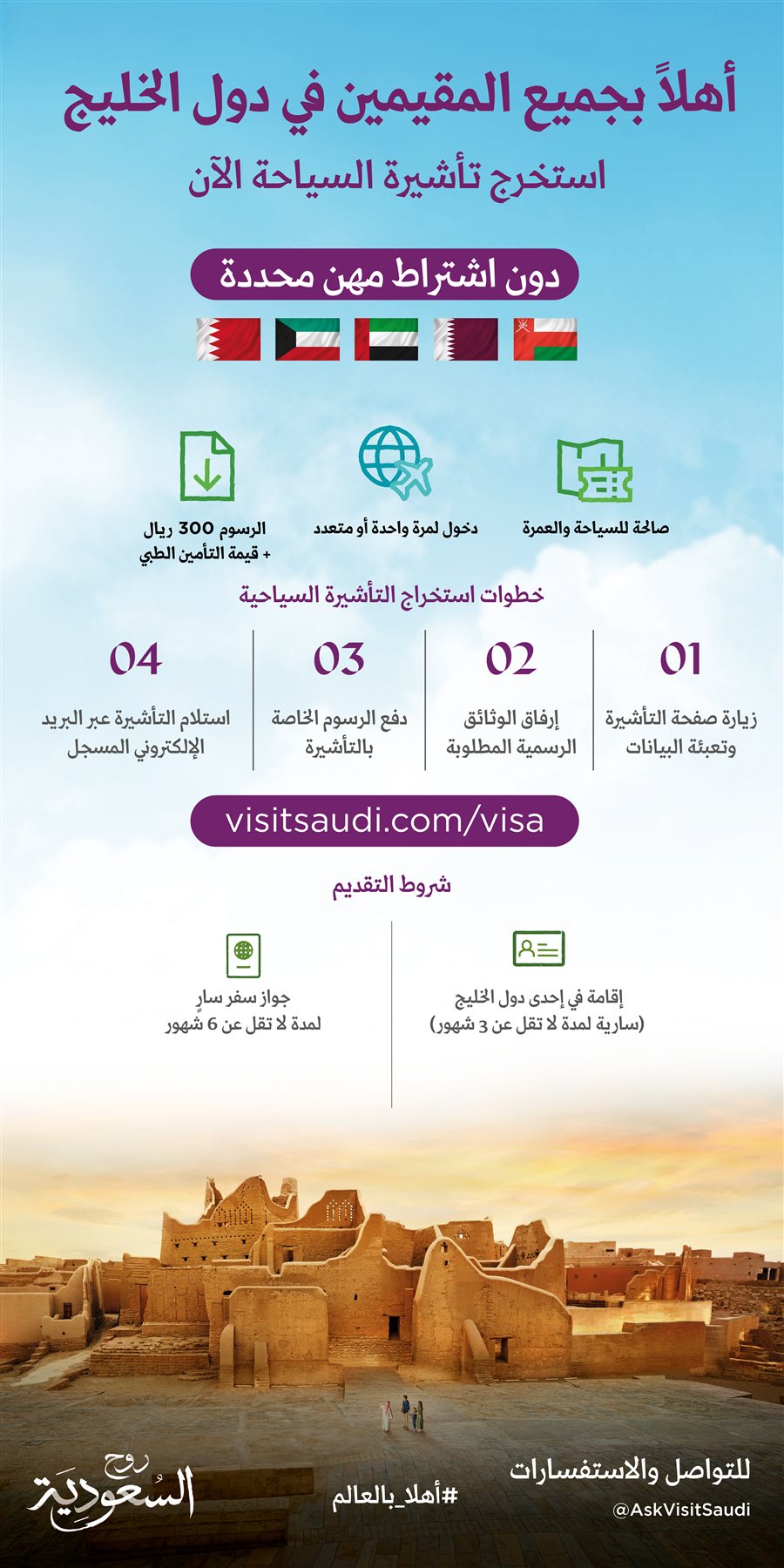 رحبت الهيئة السعودية للسياحة بالقرار؛ الذي صدر اليوم متضمناً إتاحة تأشيرة الزيارة للمقيمين بدول مجلس التعاون الخليجي، دون اشتراط مهن محددة؛ وذلك في إطار تقديم المزيد من التسهيلات، واستهداف شرائح أكبر لأداء العمرة، والاستمتاع بالوجهات السياحية، والفعاليات النوعية والعالمية حول المملكة؛ طوال العام.