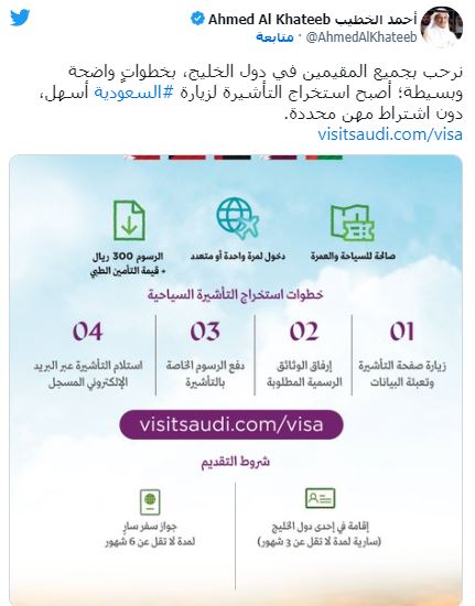 وقال وزير السياحة السعودي "نرحب بجميع المقيمين في دول الخليج، بخطواتٍ واضحة وبسيطة؛ أصبح استخراج التأشيرة لزيارة السعودية أسهل، دون اشتراط مهن محددة".