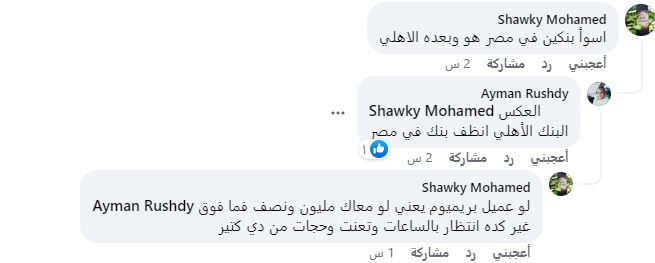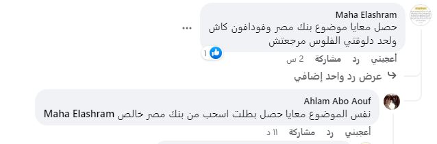 وتابعت عن مشكلتها مع البنك ،" دلوقتي بطلب حاجات من سعودي حاسبت فيزا ادانا مرفوض مرتين ف حاسبت كاش .. الفلوس اتسحبت مرتين . و لما اكلم البنك و اقولهم ان معايا الورق المرفوض يبقى الرد ان انا استنى لو سعودي ما طلبتش بفلوسه يرجعوها . الكلام دا خلال 30 يوم عمل و طبعا هينزل عليهم فوايد واصلا اول امبارح كان لسه راجعلي 2000 جنيه كنت بحاول اسحبهم فودافون كاش و بردوا المكنه عملت ري ستارت و اعدنا فيها اسبوعين او اكتر انا مش عارفه ليه بيعقبونا على غلاطتهم.. بجد أسوأ بنك في مصر و أسوأ خدمه عملاء".