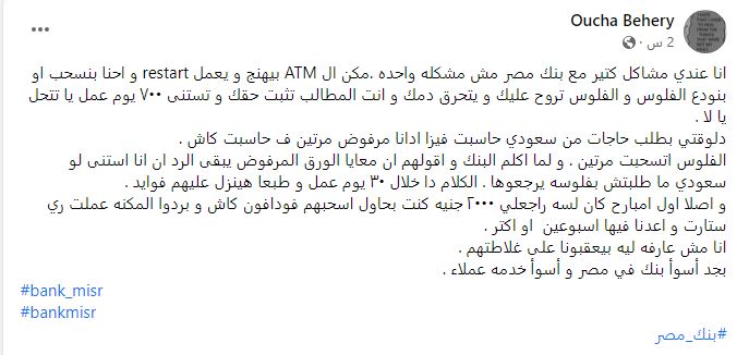 وقالت صاحبة الواقعة مع بنك مصر ،" أنا عندي مشاكل كتير مع بنك مصر مش مشكله واحده .مكن ال ATM بيهنج و يعمل restart و احنا بنسحب او بنودع الفلوس و الفلوس تروح عليك و يتحرق دمك و انت المطالب تثبت حقك و تستنى 700 يوم عمل يا تتحل يا لا ".