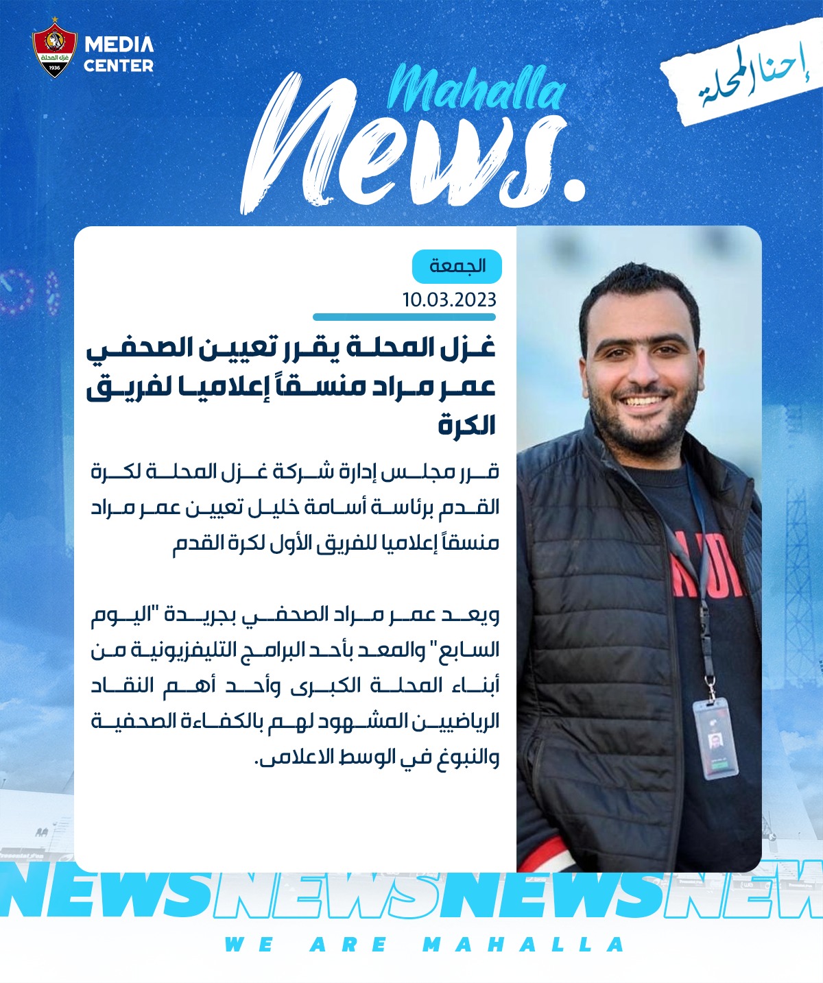 قرر مجلس إدارة شركة غزل المحلة لكرة القدم برئاسة أسامة خليل تعيين عمر مراد منسقًا إعلاميا للفريق الأول لكرة القدم.