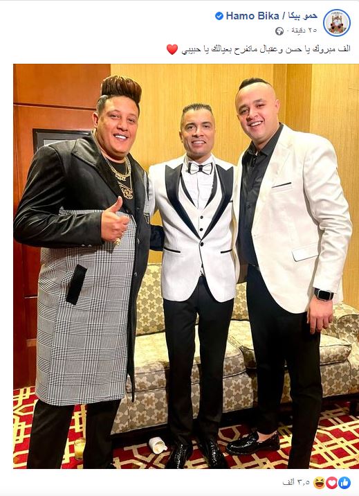 ونشر حمو بيكا، صوره بصحبة حسن شاكوش من أثناء الحفل، وعلق عليها عبر حسابه الشخصى على موقع التواصل الاجتماعى "فيسبوك"، قائلًا :" الف مبروك يا حسن وعقبال ماتفرح بعيالك يا حبيبي".