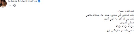 ونشرت ريهام عبد الغفور، صورة لـ كلبها، عبر حسابها الشخصي بموقع التواصل الاجتماعي “ الفيسبوك”، علقت قائلة:" مش قادرة أصدق كنت صاحبي اللي بيحبني وبيحس بيا وبيحاول يحميني.. كنت بني آدم أكتر من البني آدمين ملاكي الحارس حزينة حزينة حزينة.. حبيبي يا بينجر حتوحشني أوي".