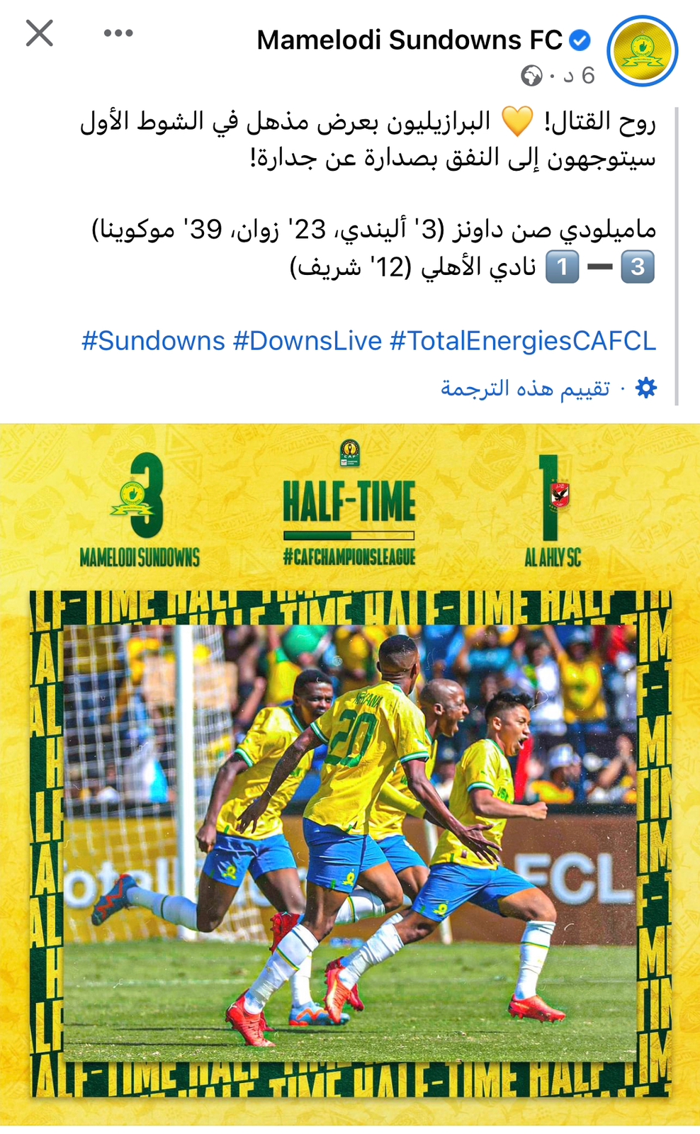 ونشرت الصفحة الرسمية لفريق صن داونز الجنوب إفريقي نتيجة المباراة، عبر موقع التواصل الإجتماعي "فيسبوك"، وكتبت : "روح القتال! البرازيليون بعرض مذهل في الشوط الأول سيتوجهون إلى النفق عن جدارة!".