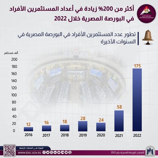 كشف مركز معلومات مجلس الوزراء أن عدد المستثمرين الأفراد في البورصة المصرية قفز مرتفعًا من نحو 12 ألف مستثمر في عام 2016 إلى 175 ألف مستثمر في 2022.