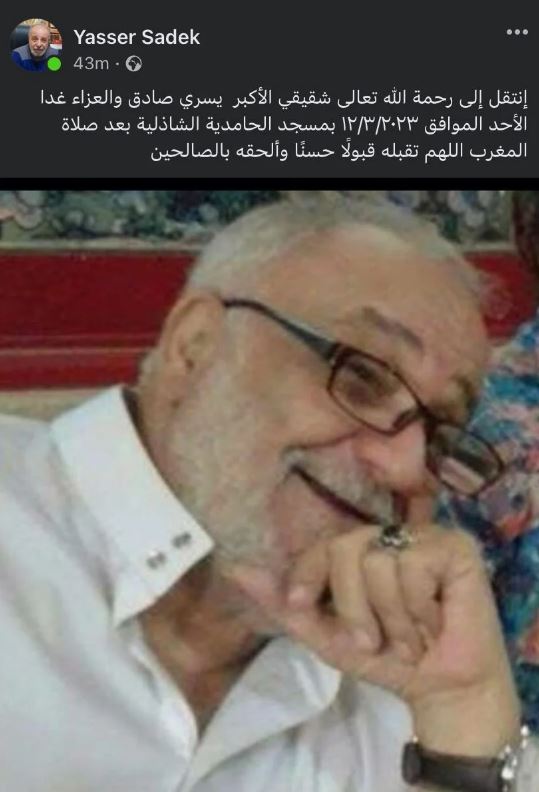 وكتب ياسر صادق، قائلًا :"إنتقل إلى رحمة الله تعالى شقيقي الأكبر يسري صادق، والعزاء غدا الأحد بمسجد الحامدية الشاذلية بعد صلاة المغرب، اللهم تقبله قبولًا حسنًا وألحقه بالصالحين".