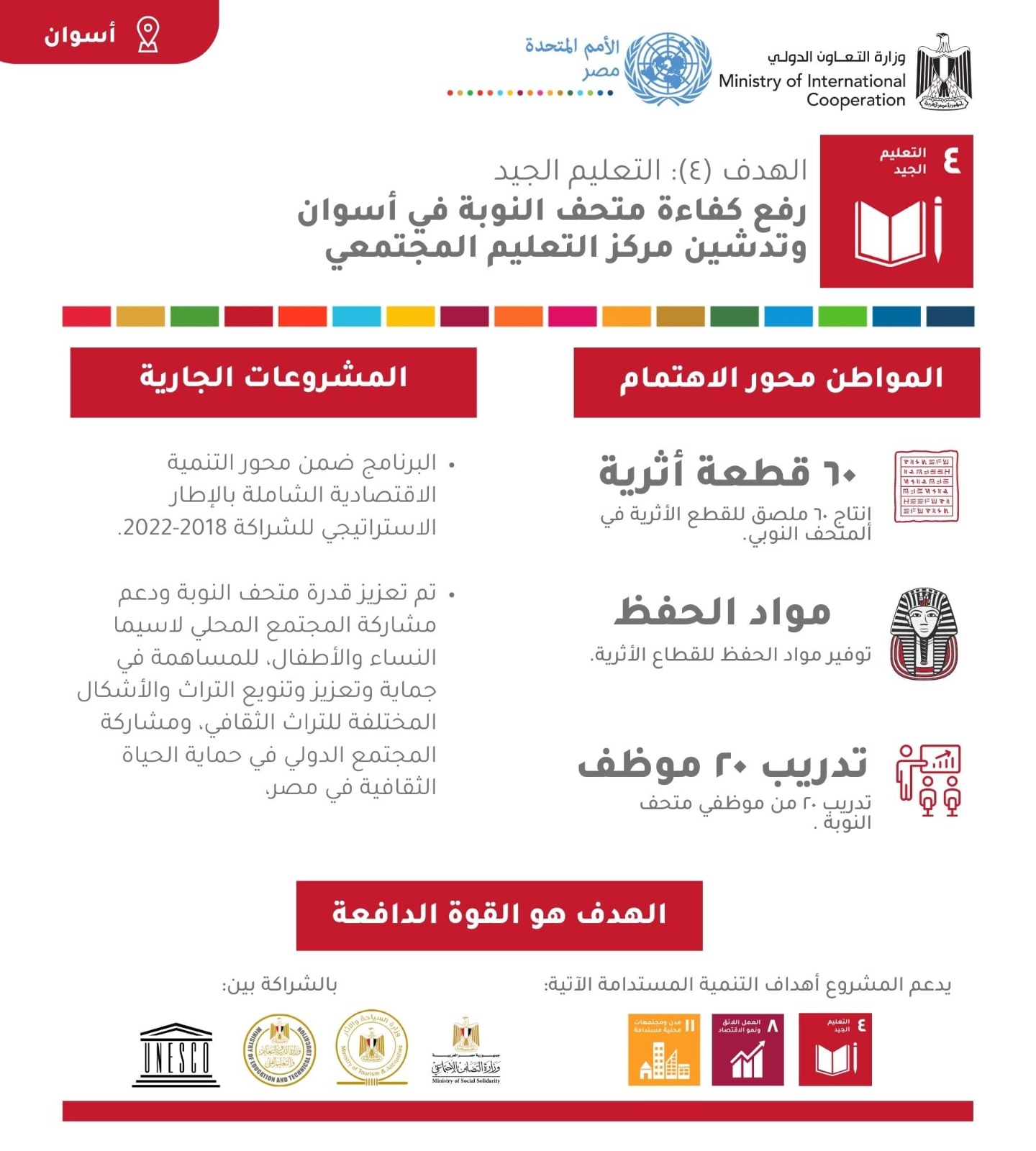 تفقدت الدكتورة رانيا المشاط، وزيرة التعاون الدولي، وإيلينا بانوفا، المنسق المقيم للأمم المتحدة في مصر، بمشاركة اللواء أشرف عطية، محافظ أسوان، ومسئولي الجهات الوطنية والوكالات الأممية المعنية، عددًا من البرامج المشروعات خلال زيارة محافظة أسوان أمس السبت، في إطار استكمال فعاليات أسبوع الشراكة بين جمهورية مصر العربية والأمم المتحدة استعدادًا لتوقيع الإطار الاستراتيجي للتعاون من أجل التنمية المستدامة 2023-2027.