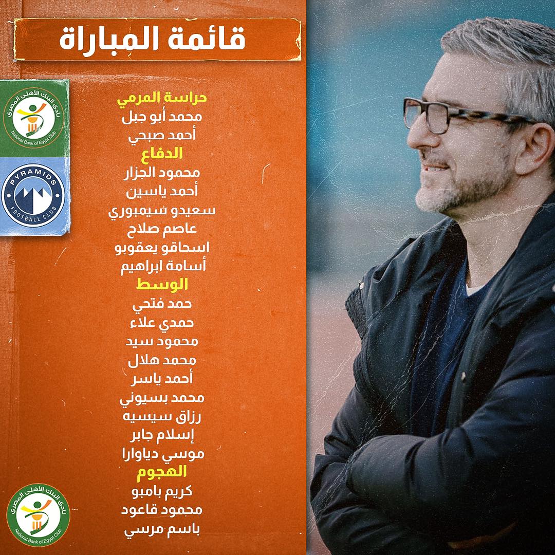 أعلن بابا فاسيليو المدير الفني لنادي البنك الأهلي قائمة فريقه لمواجهة بيراميدز ضمن لقاءات الجولة الحادية و العشرون من منافسات الدوري المصري الممتاز.