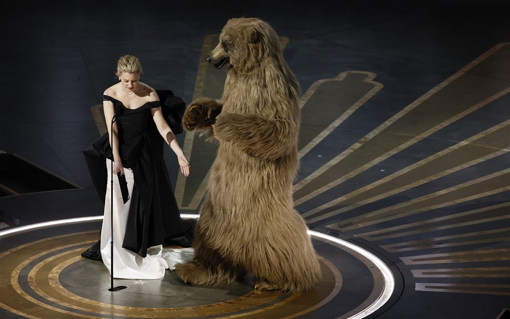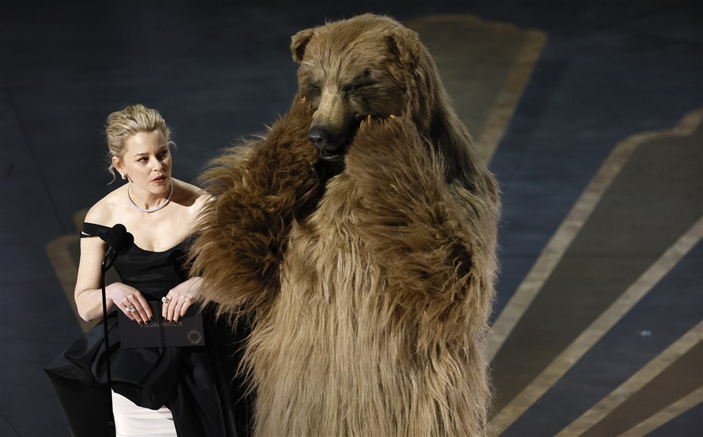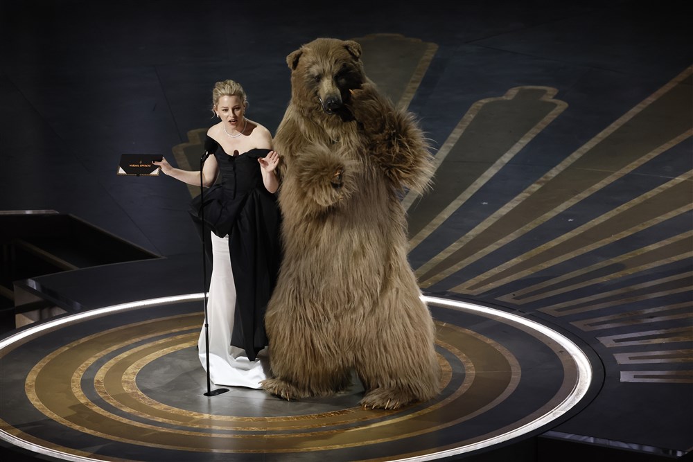اصطحبت الفنانة إليزابيث بانكس، شخصًا يرتدى زي الدب أثاء تقديهما لجائزة أفضل مؤثرات بصرية على مسرح الأوسكار.
