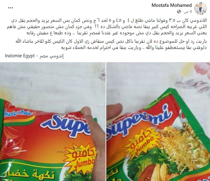وقال صاحب الواقعة ،" الاندومي كان ب3.5 وقولنا ماشي طلع ل 4 و4.5 و 5 لحد 6 ج ونص كمان بس السعر يزيد والحجم يقل دي اللي غريبه الصراحه كيس كبير يبقا نصه فاضي بالشكل ده ؟؟ وفي جزء كمان مش متصور حقيقي مش فاهم يعني السعر يزيد والحجم يقل دي مش موجوده غير عندنا فمصر تقريبا .. وده طبعا ع مفيش رقابة".