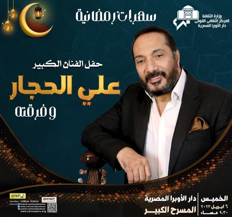 يستعد الفنان الكبير علي الحجار لإحياء حفلا غنائيا كبيرا على المسرح الكبير في دار الأوبرا المصرية برفقة فرقته الموسيقية ضمن السهرات الرمضانية، وذلك يوم الخميس 6 أبريل المقبل الساعة 9 ونصف مساء.