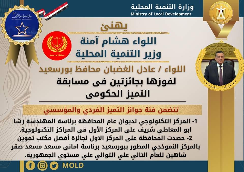 هنأ اللواء هشام ٱمنة وزير التنمية المحلية، اللواء عادل الغضبان محافظ بورسعيد، وذلك لفوز المحافظة بجائزتين في مسابقة التميز الحكومي التي تتضمن فئة جوائز التميز الفردي والمؤسسي، حيث حصل المركز التكنولوجى بديوان عام المحافظة وذلك برئاسة المهندسة رشا أبو المعاطي شريف علي المركز الأول في المراكز التكنولوجية، كما حصدت المحافظة أيضًا المركز الأول لجائزة أفضل مكتب تموين بالمركز النموذجي المطور ببورسعيد برئاسة اماني مسعد مسعد صقر شاهين للعام الثاني علي التوالي علي مستوى الجمهورية.