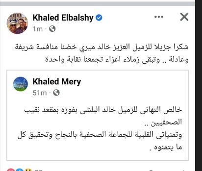 وقال "البلشي": "شكراً جزيلا للزميل العزيز خالد ميري خضنا منافسة شريفة وعادلة.. وتبقي زملاء اعزاء تجمعنا نقابة واحدة".