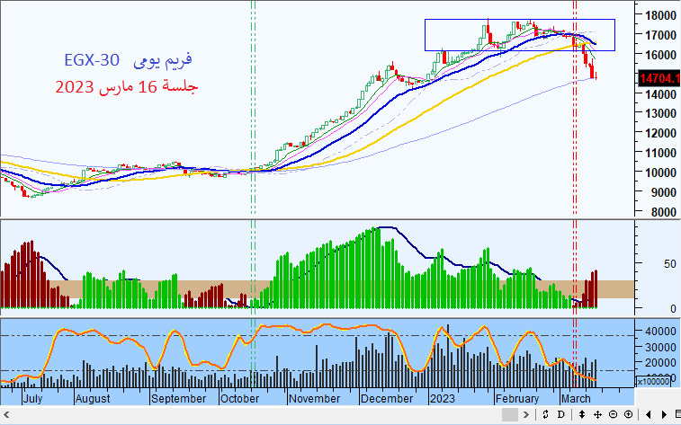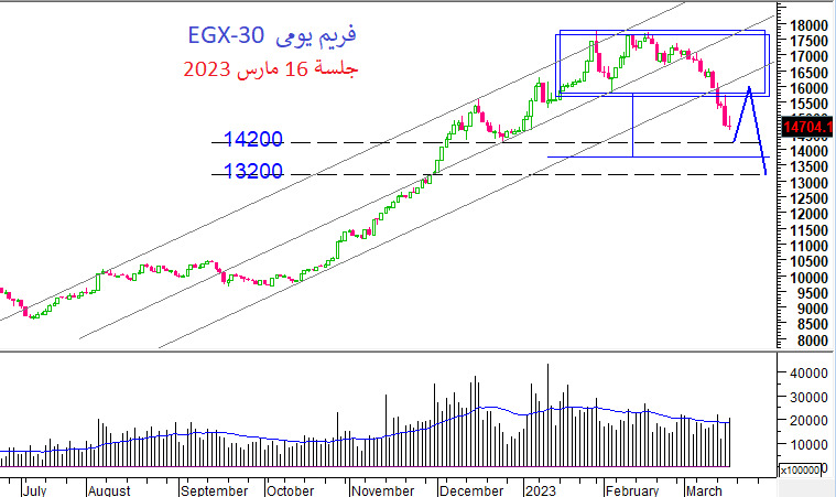وأضاف عثمان ": حاليا نتوقع أن يتحرك المؤشر فى حركة تصحيحية لأعلى و لو هبط أولا يمكن أن يكون الهبوط بين منطقة 14500 او 14200 و من هذة المناطق يمكن أن يكون الصعود لمناطق قد تصل الى 15800 او 16100 و التى منها نتوقع إعادة الهبوط مرة أخرى لإستهداف قاع جديد قرب مناطق 13500 و 13200 نقطة .