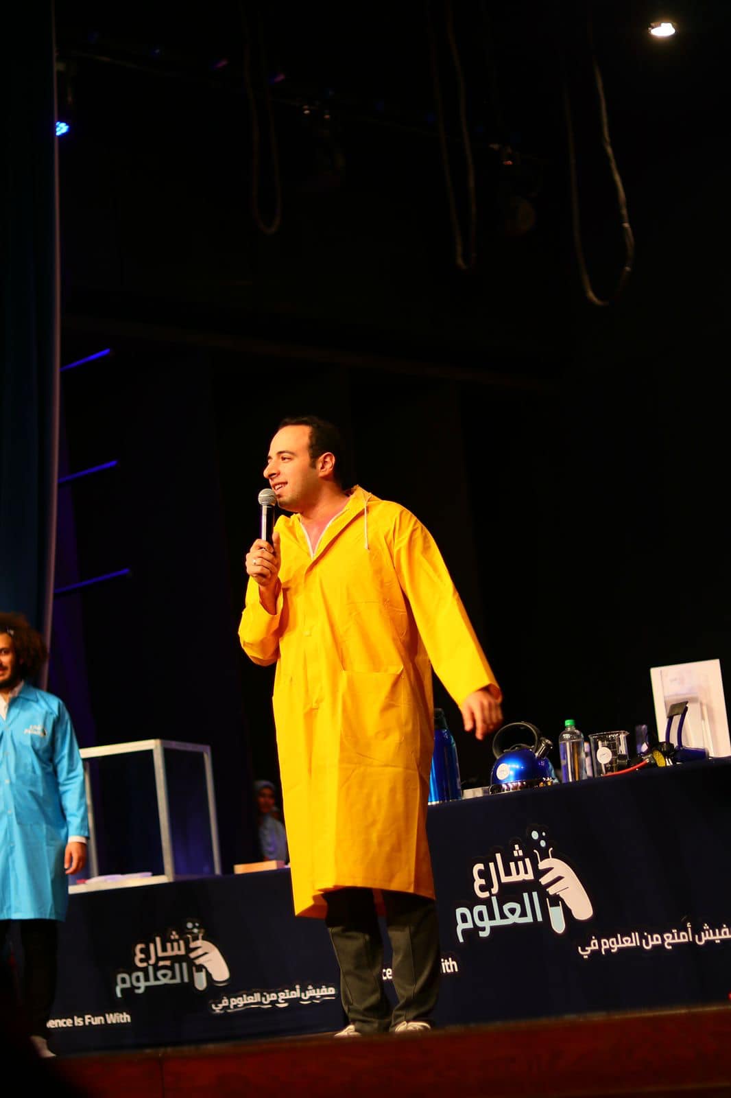 وقدم صانع المحتوي "عبد الله عنان" مؤسس برنامج شارع العلوم عرضاً، تناول خلاله عدداً كبيراً من التجارب العلمية والألعاب الضوئية من خلال تنفيذ التجارب العلمية بشكل ممتع ومرح تفاعل معه النشء والشباب الحضور بمساعدة فريق عمله، ومنهم دعاء السيد مشرفة المحتوي العملي بفريق شارع العلوم، ومحمد عصام مشرف تبسيط العلوم، وحسين القزاز فريق تحضير التجارب، وقد تضمن العرض مشاركة صانع المحتوي احمد الغندور مقدم برنامج الدحيح كضيف شرف الحفل.