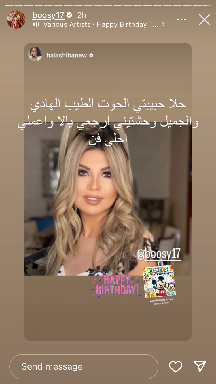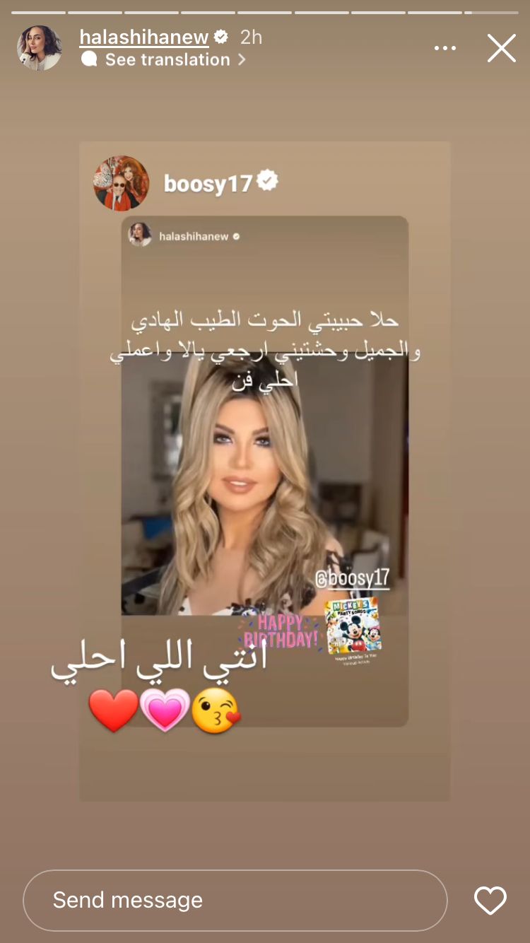 ونشرت حلا شيحة، مقطع أغنية من خلال خاصية "الاستورى"، وردت عليها بوسى شلبى، قائلة :"حلا حبيبتي الحوت الطيب الهادى والجميل وحشتينى، ارجعى يالا واعملى أحلى فن".