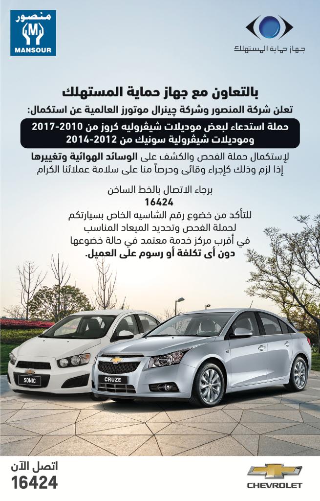أعلن جهاز حماية المستهلك، بالتعاون مع شركة المنصور وجنرال موتورز العالمية، عن حملة استدعاء لاستكمال الفحص والكشف المجاني علي الوسائد الهوائية، وتغييرها إذا لزم الأمر، حيث يأتى ذلك في إطار الإطمئنان علي جودة وفاعلية المنظومة، وحرصاً من الجهاز على أمن وسلامة المُستهلكين، دائما، كإجراء وقائى.