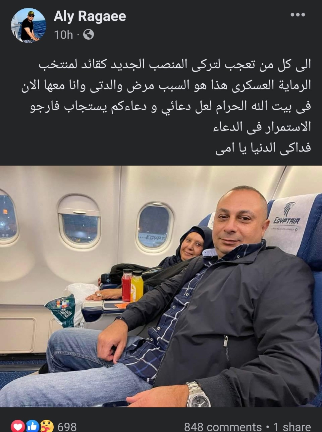 كتب على رجائي قائد فريق الدفاع الجوي المصري، لـ متابعينه عبر برنامج التواصل الاجتماعي "فيسبوك" الخاص به ، السبب الحقيقي وراء ترك منصبه الجديد ، كـ قائد لمنتخب الرمايه العسكريه ، "الى كل من تعجب لتركى المنصب الجديد كقائد لمنتخب الرماية العسكرى هذا هو السبب مرض والدتى وانا معها الان فى بيت الله الحرام لعل دعائي ودعاءكم يستجاب فارجو الاستمرار فى الدعاء.. فداكى الدنيا يا امى" .