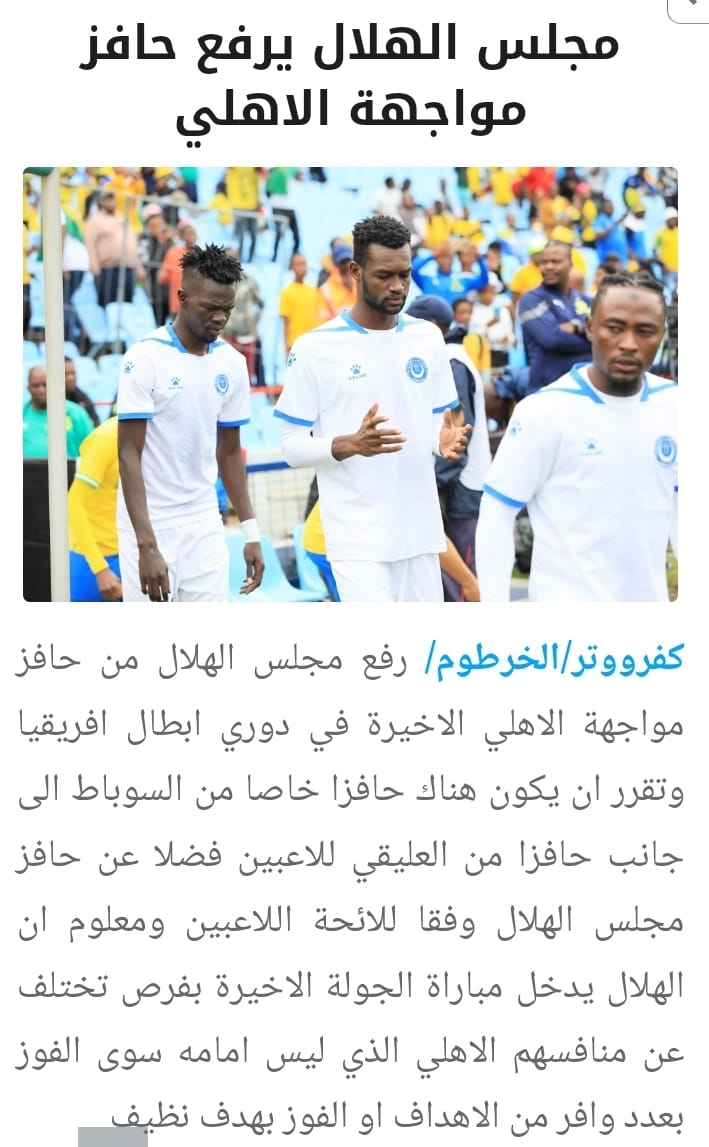 وعنونت صحيفة "كفرووتر" السودانية، "الهلال يرفع الحوافز والمكافآت للفوز علي الأهلي"، وتابعت أن مجلس نادى الهلال قرر رفع حافز مواجهة الأهلي الأخيرة في دوري أبطال أفريقيا ليكون هناك حافز خاص من السوباط، إلى جانب حافز من العليقي للاعبين، فضلا عن حافز مجلس الهلال وفقا للائحة اللاعبين.