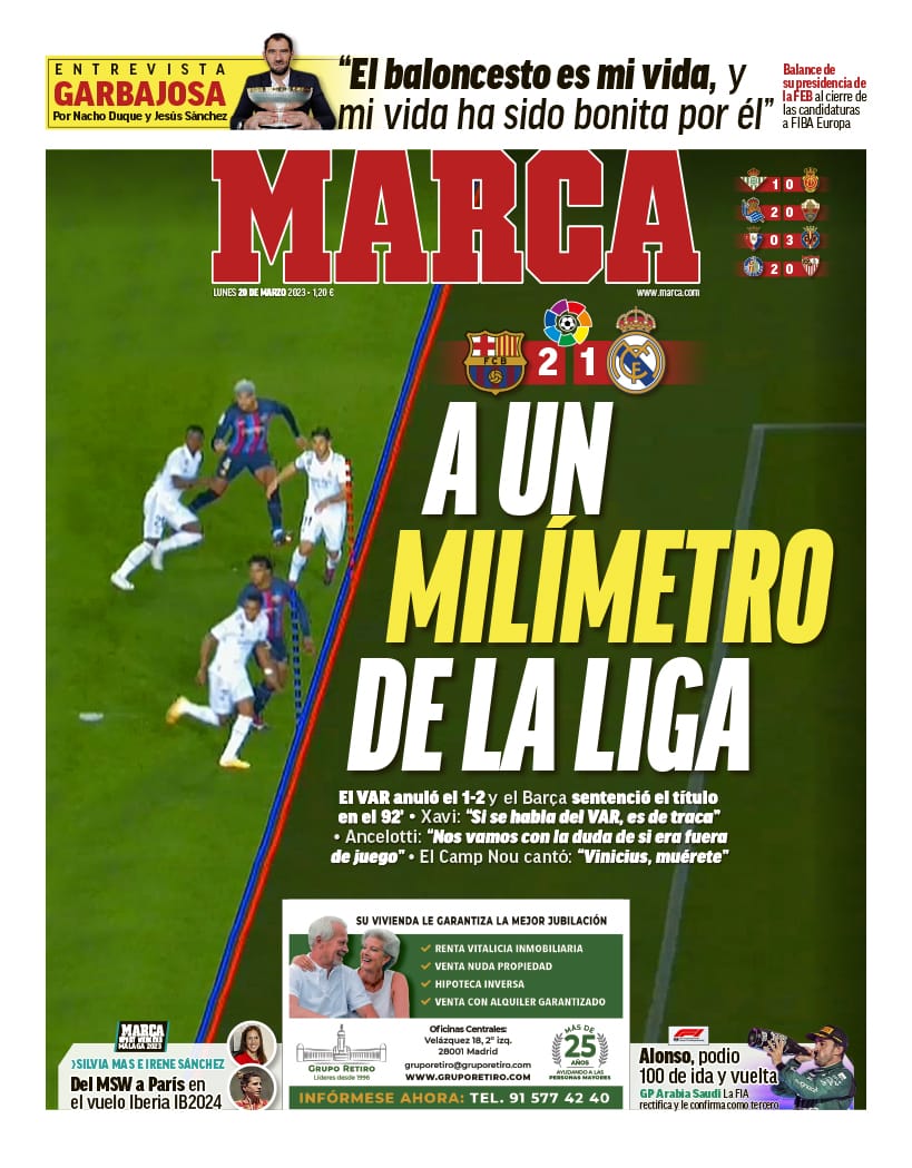 وأضافت صحيفة "ماركا" الإسبانية، "مليمتر من الليجا، ألغى الفار هدف ريال مدريد وأنهى برشلونة المباراة عند الدقيقة 92".