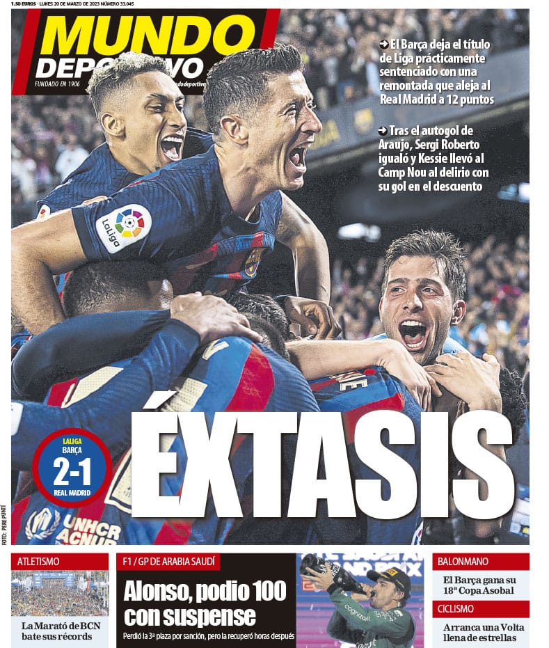 فيما كتبت صحيفة "موندو ديبورتيفو"، "النشوة"، إلى جانب صورة جمعت بين لاعبي برشلونة اثناء أحتفالهم بتسجيل الهدف الحاسم لبرشلونة ليحسم الكلاسيكو، ويرفع رصيد البرسا إلى 300 هدف علي ملعب كامب نو.