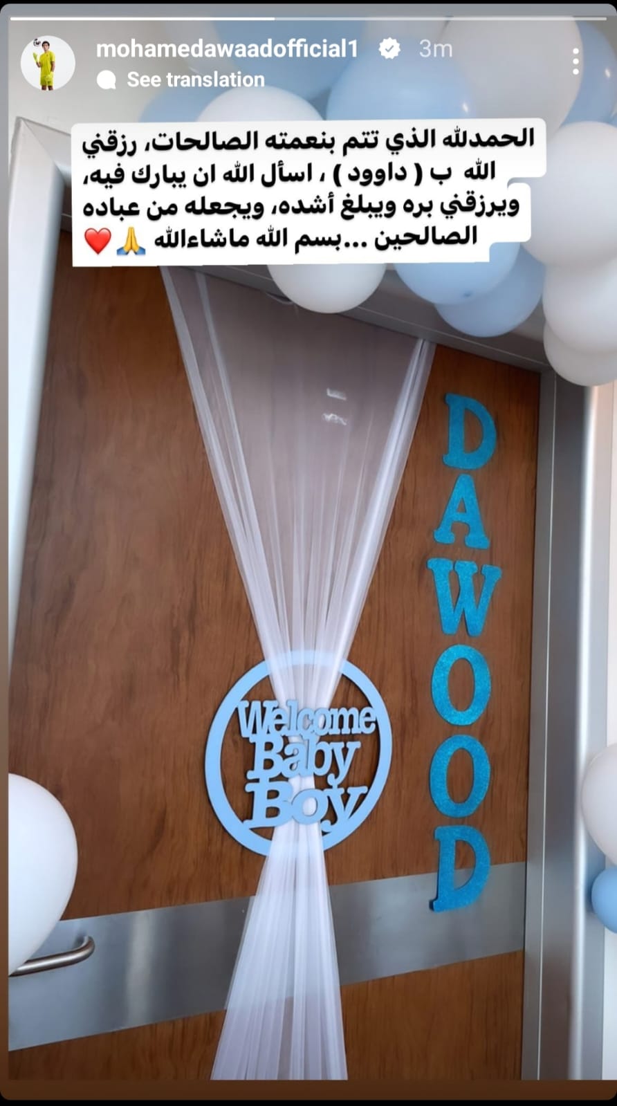 وكتب محمد عواد من خلال تقنية "الأستوري"، بموقع التواصل الإجتماعي "أنسجرام": "الحمد لله الذى بنعمته تتم الصالحات، رزقني الله ب(داوود)، أسأل الله أن يبارك فيه ويرزقني بره ويبلغ أشده، ويجعله من عباده الصالحين، بسم الله ماشاء الله"