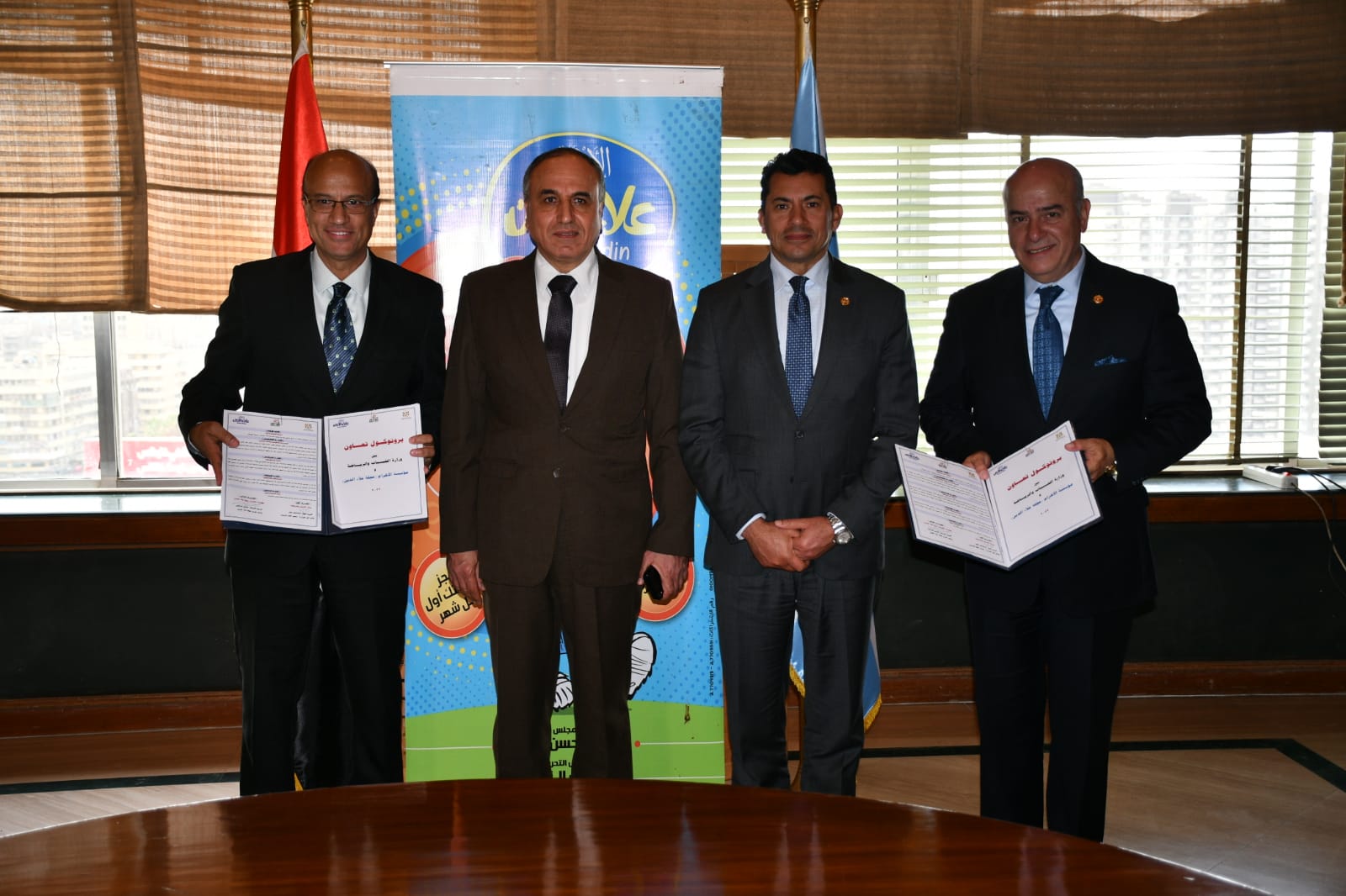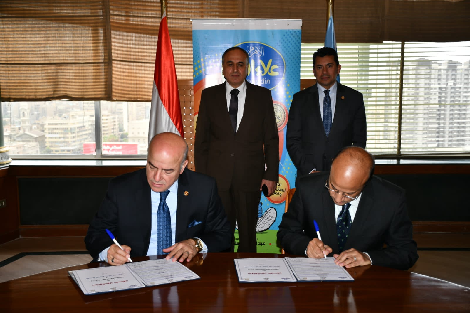 قام بتوقيع البروتوكول اللواء اسماعيل الفار رئيس قطاع الشباب بوزارة الشباب والرياضة والاستاذ حسين الزناتي رئيس تحرير مجلة علاء الدين.
