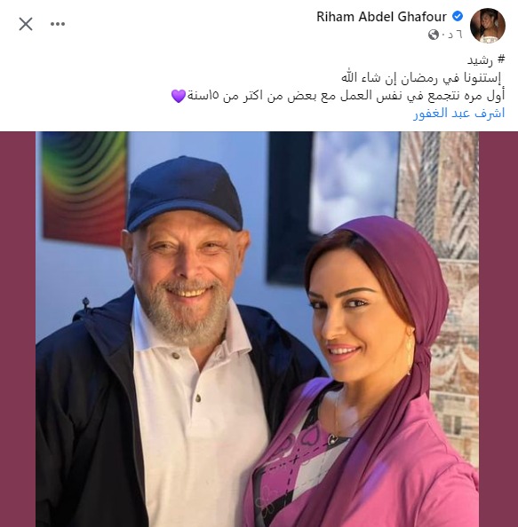 وعلقت ريهام عبد الغفور عبر حسابها الشخصي بموقع التواصل الاجتماعي "الفيسبوك"، قالت:"رشيد.. استنونا في رمضان إن شاء الله، أول مره نتجمع في نفس العمل مع بعض.. من أكتر من 15 سنة".