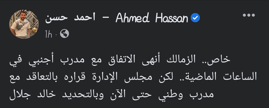 وكتب أحمد حسن علي صفحته الشحصية علي موقع التواصل الإجتماعي "فيسبوك": "خاص.. الزمالك أنهى الاتفاق مع مدرب أجنبي في الساعات الماضية.. لكن مجلس الإدارة قراره بالتعاقد مع مدرب وطني حتى الآن وبالتحديد خالد جلال".