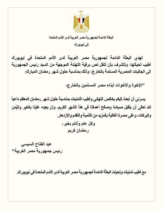 الأخوة والأخوات أبناء مصر المسلمين بالخارج، يسرني أن أبعث إليكم بخالص التهاني وأطيب التمنيات بمناسبة حلول شهر رمضان المعظم داعيًا الله تعالي أن يتقبل صيامنا وصالح أعمالنا في هذا الشهر الكريم، وأن يعيده علينا بالخير واليمن والبركات، وعلى مصرنا الغالية بالمزيد من التنمية والتقدير والإزدهار.
